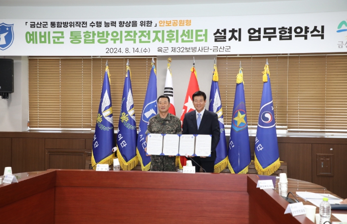 [뉴스서치] 금산군은 지난 14일 육군 제32보병사단과 금성면 도곡리 186-5 일원 부지를 활용한 주민 친화형 안보공원 및 예비군 통합방위작전지원센터 조성하기 위한 업무협약을 체결했다.