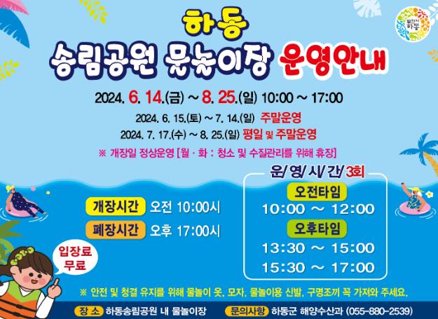하승철 하동군수는 “송림공원 물놀이장은 접근성은 물론 국가하천인 섬진강과 송림공원이 함께 어우러져 온 가족이 함께 즐길 수 있는 여름 대표 물놀이 명소가 됐다”며, “깨끗한 환경에서 무더위를 식힐 수 있도록 그늘막 확대 및 수질관리 등 안전사고 예방에도 최선을 다하겠다”고 밝혔다.