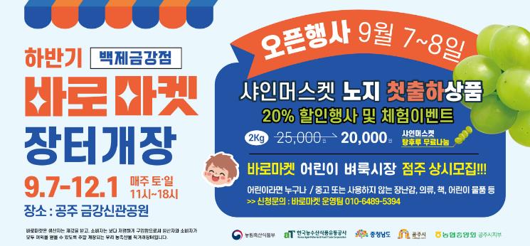 ‘바로마켓 백제금강점’은 공주에서 생산한 제철 농산물을 합리적인 가격에 구매할 수 있는 직거래 장터로, 하반기 장터는 7일 개장해 12월 1일까지 매주 토요일과 일요일 금강신관공원에서 열린다.