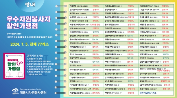 할인 가맹점은 우수자원봉사자증을 소지한 봉사자가 상품이나 서비스 구매 시 최소 5% 이상의 약정 할인을 받을 수 있도록 혜택을 제공하고 있으며, 우수자원봉사자증은 누적 100시간 이상 자원봉사활동을 하면 자원봉사센터에서 발급 가능하다.