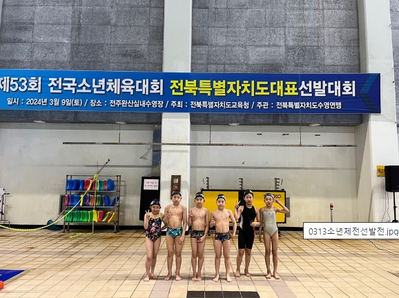 공공스포츠클럽 수영선수반은 지난 9일 전주완산수영장에서 열린 제53회 전국소년체육대회 전북특별자치도 대표선발전에서 지도자(황은지)와 선수들의 노력으로 4명이 선발되는 쾌거를 이뤘다.