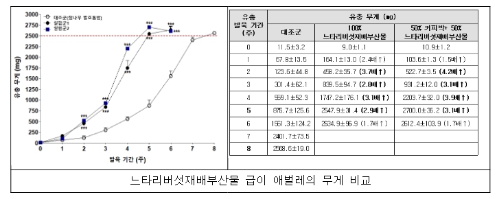 ▲ 느타리버섯재배부산물 활용 먹이원 급이 흰점박이꽃무지 애벌레의 발육 특성
