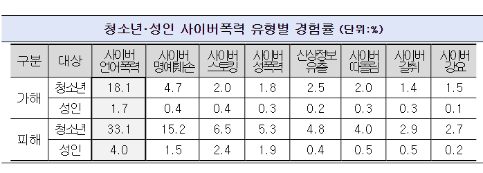 조사 결과에 따르면, 우리나라 청소년 40.8%, 성인 8.0%가 사이버폭력(가해+피해+가·피해)을 경험한 것으로 나타났다. 이 수치는 전년 대비 청소년의 경우 0.8%p, 성인의 경우 1.6%p가 감소한 수치다. 이는 지난해 5월 정부에서 ‘코로나19 팬데믹’ 종식을 선언하면서 완전한 일상 회복이 이루어져 온라인 활동에 대한 의존도가 줄어든 결과로 보인다.