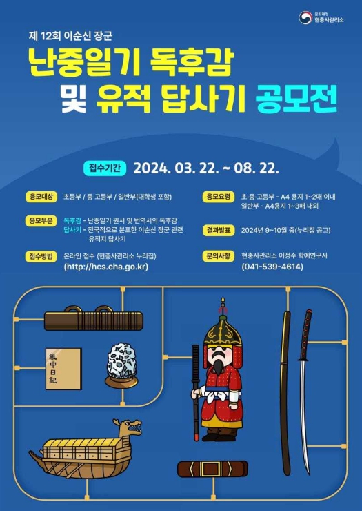 공모전에 관한 자세한 사항은 문화재청 누리집과 현충사관리소 누리집을 참고하면 된다.