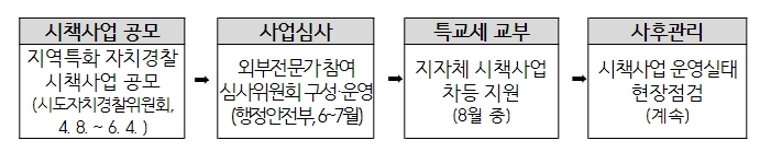 행안부는 대학교수, 연구원, 기업가 등 현장경험이 있는 시책사업 전문가로 사업선정 심사위원회(5인 내외)를 구성해 서면심사(6월)와 현장심사(7월)를 실시하고, 최종 선정된 지자체에는 8월 중 특교세를 지원할 예정이다.
