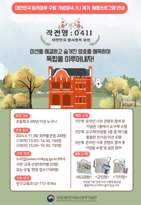 [뉴스서치] 국가보훈부는 국립대한민국임시정부기념관에서 임시정부수립 기념일인 오는 11일, 외교관과 기자, 군인 등 임시정부 요인들의 직업과 독립운동 활동을 알아볼 수 있는 체험형 교육프로그램인 ‘작전명 0411’을 운영한다고 밝혔다.