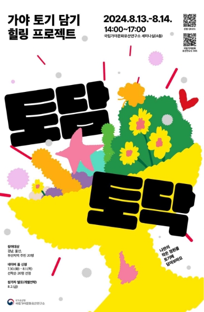 [뉴스서치] 국가유산청 국립문화유산연구원 국립가야문화유산연구소는 8월 13일과 14일 양일간 국립가야문화유산연구소 세미나실(경남 창원시)에서 여름방학을 맞아 경남을 비롯한 부산·울산 지역 주민을 대상으로 가야 토기를 활용한 체험·치유 프로그램 '토담 토닥'을 운영한다.