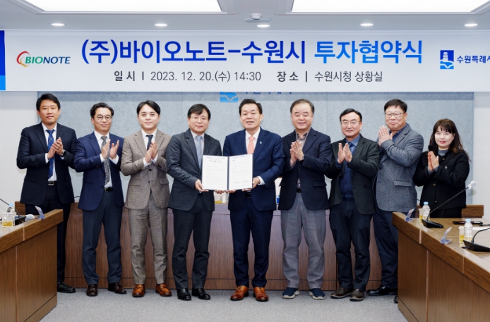 ▲ 지난해 12월 수원시와 ㈜바이오노트 투자협약식에서 이재준 수원특례시장과 참석자들이 기념촬영을 하고 있다. |