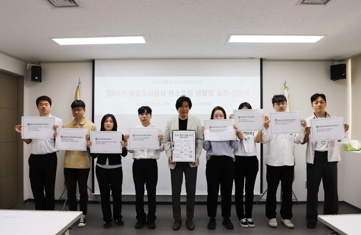 지난 4일 공사 임직원이 참여하여 ‘탄소 중립 생활화 실천 8대 수칙’을 공유하고 생활 속 실천을 다짐하는 ‘광명도시공사 탄소중립 생활화 실천 선언식’을 실시했다. 탄소 중립 생활화 실천 8대 수칙의 주요 내용은 ‘에너지 사용량 줄이기 실천하기’,‘디지털 탄소 발자국 줄이기 실천하기’,‘종이 없는 회의 문화 실천하기’ 등이다.
