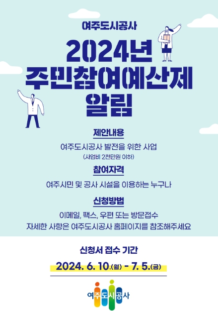 [뉴스서치] 여주도시공사에서는 6월 10일부터 7월 5일까지 약 한달간 2025년 본예산에 반영할 주민 제안 사업을 공모한다.