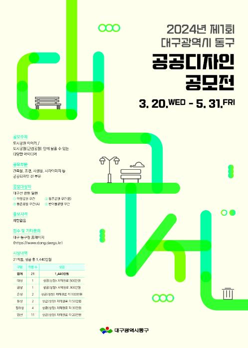 [뉴스서치] 대구 동구청은 도시공원(근린공원) 안에 담을 수 있는 다양한 아이디어를 발굴하기 위해 ‘제1회 대구광역시 동구 공공디자인 공모전’을 개최한다.