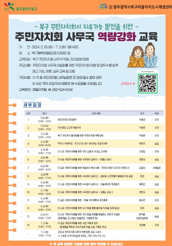 참여를 희망하는 교육 대상은 홍보 웹자보에 있는 QR코드를 통해 네이버폼을 작성․제출하면 되고 기타 자세한 사항은 북구마을자치도시재생센터에 전화 문의하면 된다.