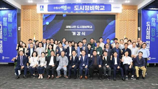 ▲ 수원시가 도시정비사업 관련 전문교육을 위해 진행한 ‘새빛시민 도시정비학교’ 개강식에서 참석자들이 기념촬영을 하고 있다. |