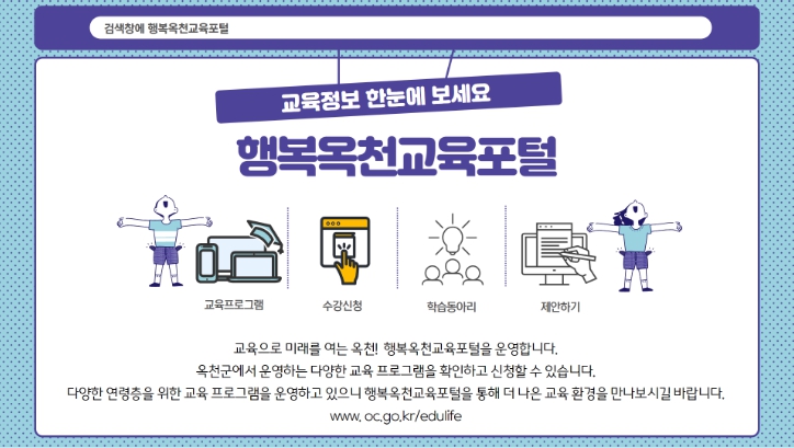 황규철 옥천군수는 “평생학습의 새로운 문을 열어줄 행복옥천교육포털을 통해 많은 분이 새로운 지식과 경험을 쌓으시길 기대한다”며 “홈페이지 운영에 대한 주민 의견을 받아 지속해서 업데이트해 주민의 다양한 학습 요구에 부응하고자 노력하겠다”고 밝혔다.
