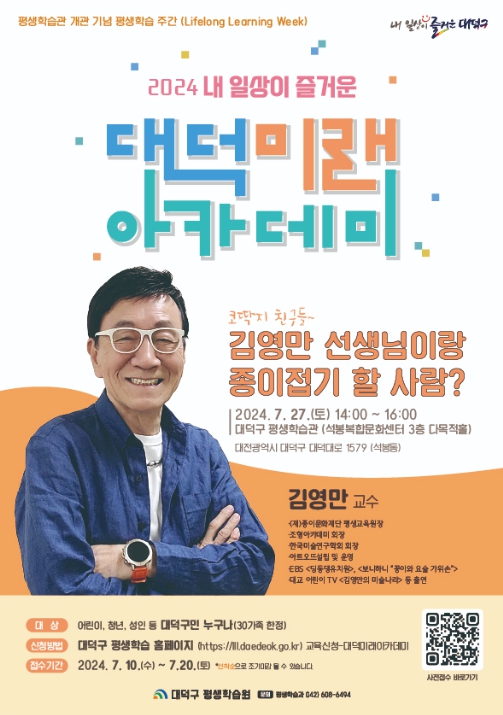 [뉴스서치] 대전 대덕구는 오는 27일 ‘2024년 내 일상이 즐거운 대덕미래아카데미’의 일환으로 ‘종이접기 아저씨’ 김영만 교수를 초청해 강연을 진행한다고 밝혔다.