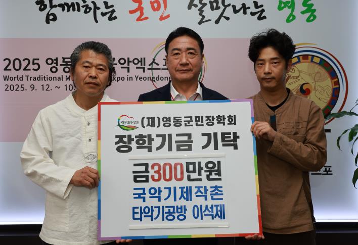 [뉴스서치] 충북 영동군 난계국악기제작촌 타악기 공방 이석제 대표가 지난 19일 영동군을 찾아 (재)영동군민장학회에 300만원의 장학금 맡겼다.