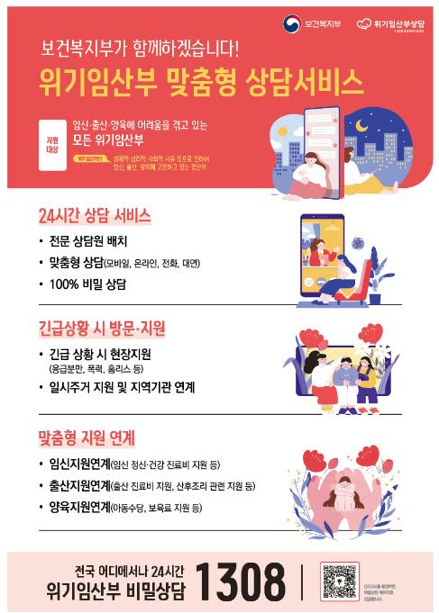 또한 전국 단위로 운영되는 위기 임산부 긴급전화 ‘1308’을 통해서도 24시간 맞춤형 상담서비스를 지원받을 수 있다.