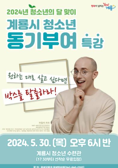 2024년 청소년의 달을 맞이하여 개최되는 이번 강연은 계룡시 청소년 150여 명을 대상으로 진행하며, 강의 1시간 전부터 선착순 입장할 예정이다.
