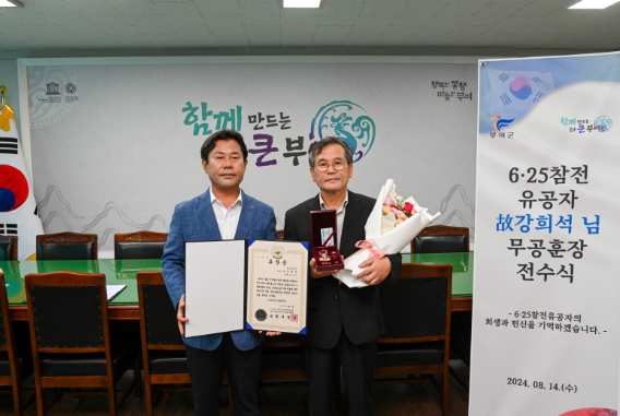 [뉴스서치] 부여군은 지난 14일 군수실에서 6·25전쟁 참전유공자 故강희석님의 무공훈장 전수식을 가졌다.