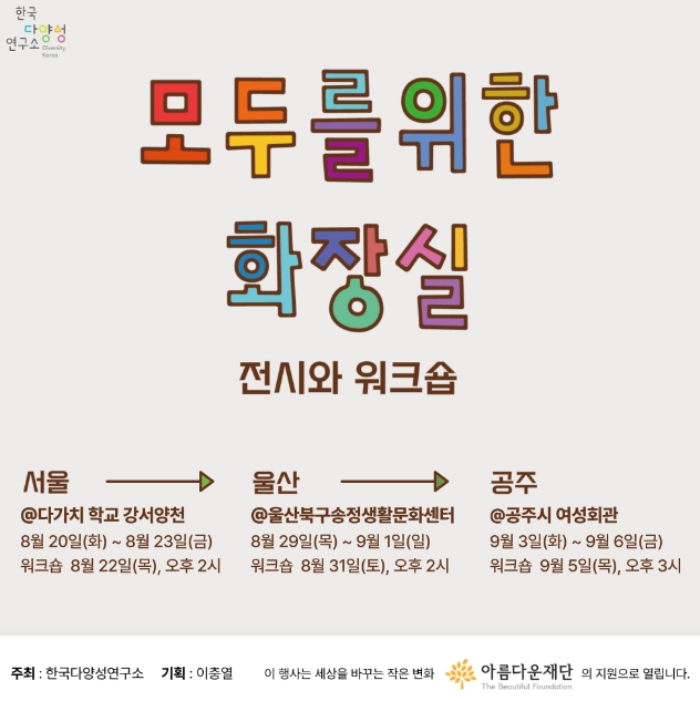 또한, 아름다운재단의 지원으로 모두를위한화장실 사업을 진행하고 있는 한국다양성연구소 측은 “늘 당연하게 생각해 온 화장실이라는 공간을 더 넓게 상상해 보면 좋겠다. 모두가 자신이 필요할 때 빠르고 안전하게 청결한 화장실을 사용할 수 있는 사회가 될 수 있기를 바란다”라고 말했다.