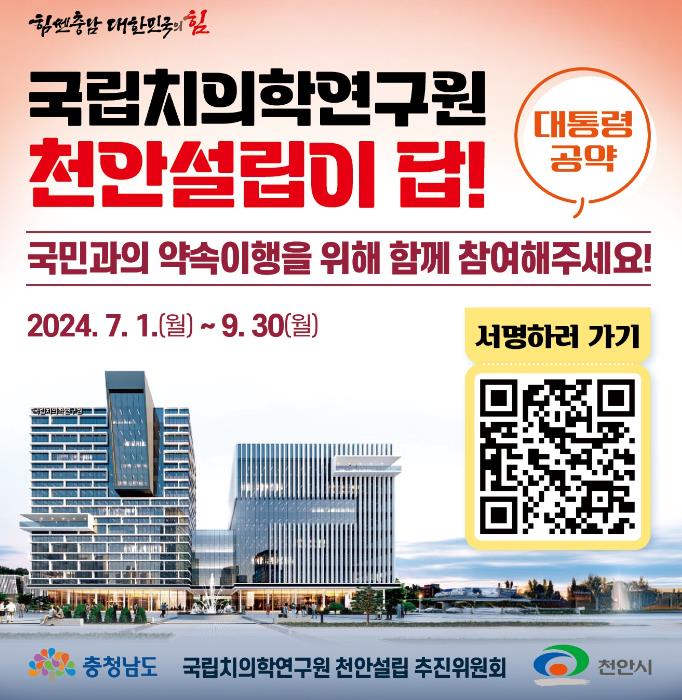 시는 충청남도와 함께 9월까지 ‘제20대 대통령 충남지역공약 국립치의학연구원 설립’ 조속 이행을 위해 범도민 100만 명 서명운동을 실시한다.