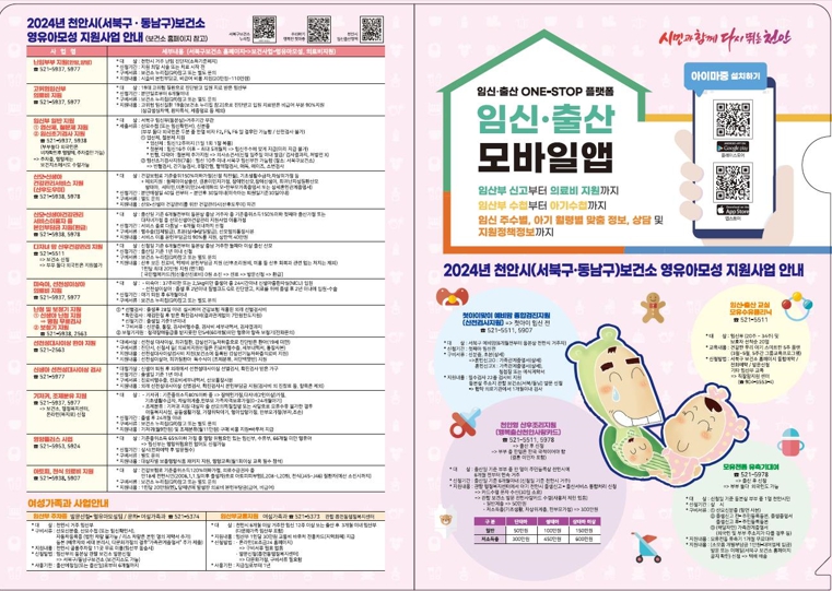 임신 전에는 임신을 준비하는 가임기 여성에서 꼭 필요한 검사항목으로 구성된 ‘첫아이 맞이 예비맘 종합건강검진’을 지원하며, 천안시 6개월 이상 거주한 첫아이 임신 전 예비산모를 대상으로 천안시와 협약된 21개 의료기관에서 22종의 검진을 받을 수 있도록 비용을 지원한다.