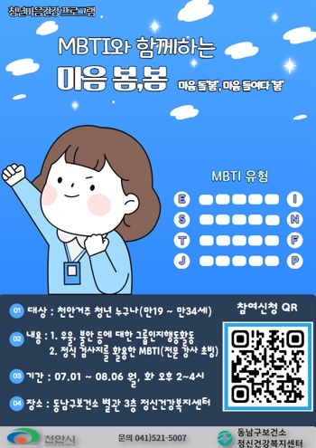 [뉴스서치] 천안시 동남구 정신건강복지센터는 청년들의 정신건강을 지원하기 위해 우울, 불안 등 정신과적 문제를 가진 만 19세~35세 청년을 대상으로 다음달 1일부터 8월 6일까지 ‘마음, 봄봄’프로그램을 운영한다고 밝혔다.