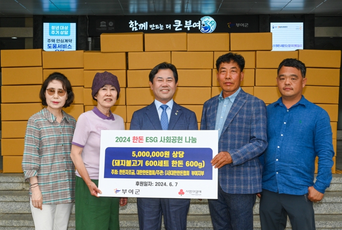 [뉴스서치] 대한한돈협회 부여지부는 지난 7일 저소득층에 전달해 달라며 돼지불고기(600g) 600세트(500만원 상당)를 부여군에 전달했다.