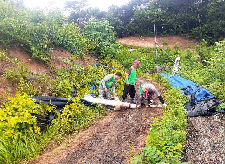 특히 비봉면에서는 주택 뒤 사면 유실로 인한 토사제거, 배수로설치 및 방수포 작업을 실시하였다.