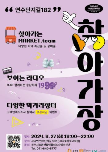 [뉴스서치] 공주시는 오는 27일 LX국토정보교육원에서 ‘자생강화마켓 연수단지길182(LX) 찾아가장(場)’ 행사를 개최한다고 밝혔다.