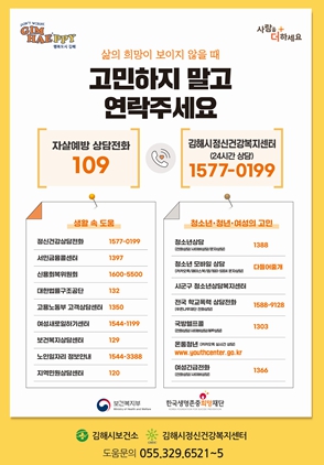 허목 김해시보건소장은 “마음이 힘들면 혼자서 고민하지 말고 전문기관에 도움을 요청할 수 있는 것도 용기이자 권리임을 알고 꼭 도움을 요청해 주시길 바란다”고 말했다.