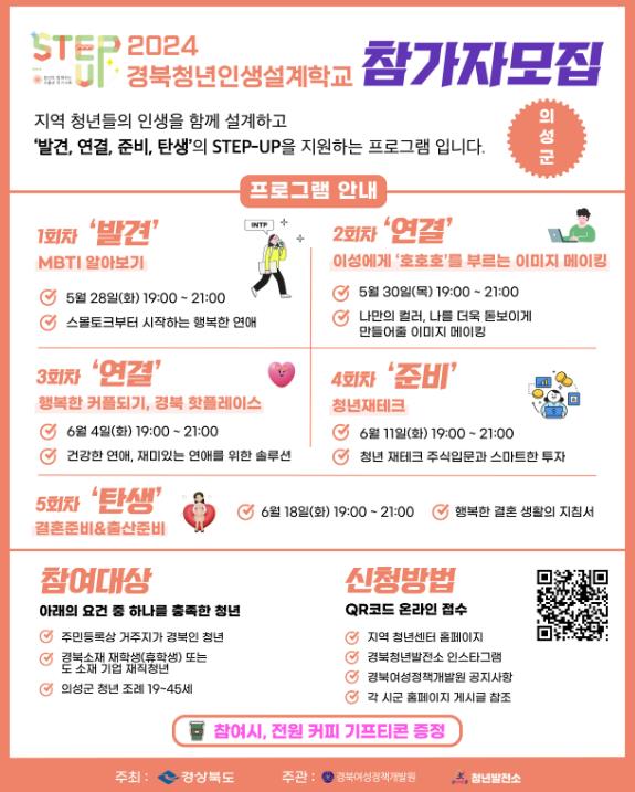 이 프로그램은 경북도 주최하며 청년 대상 저출생 인식개선을 위한 “청년 인생 주기 맞춤형” 교육 프로그램으로 의성군을 포함한 경북도 내 7개 시군에서 운영된다.