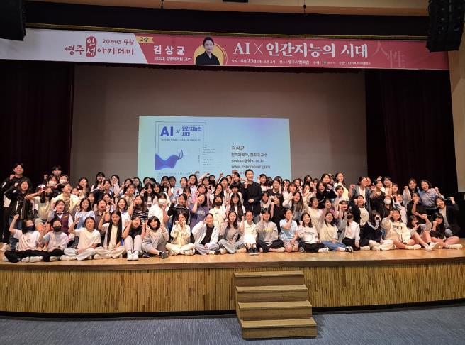 ▲ 4월 영주인성아카데미 강연자 김상균 교수와 참석 학생들이 기념촬영을 하고 있다 |