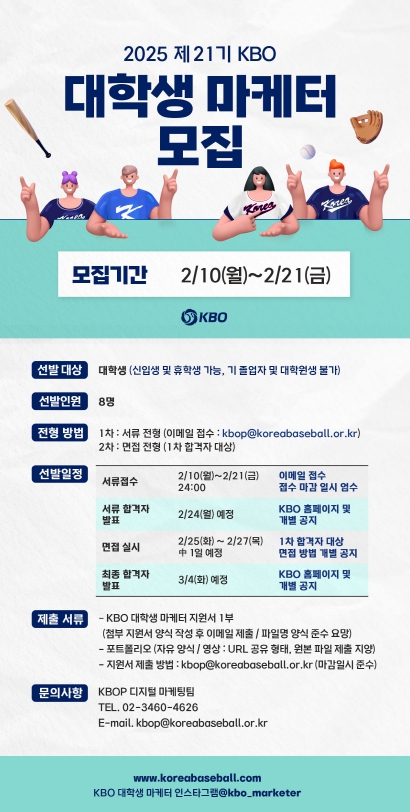 [뉴스서치] KBO가 2월 10일(월)부터 2025 제 21기 KBO 대학생 마케터를 모집한다.