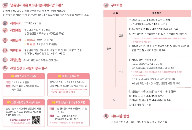더불어 냉동난자 사용 보조생식술 지원 사업은 가임력 보존을 위해 냉동한 난자를 사용해 임신·출산을 시도하는 부부(사실혼)를 대상으로 냉동 난자 해동과 보조생식술 비용을 회당 100만 원 한도로 최대 2회까지 지급한다.