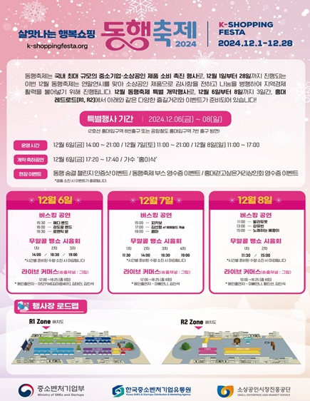[뉴스서치] 중소벤처기업부는 6일부터 8일까지 ‘12월 동행축제’ 개막행사를 열고, 다양한 중소기업·소상공인 제품 홍보·판매관을 운영한다고 밝혔다.