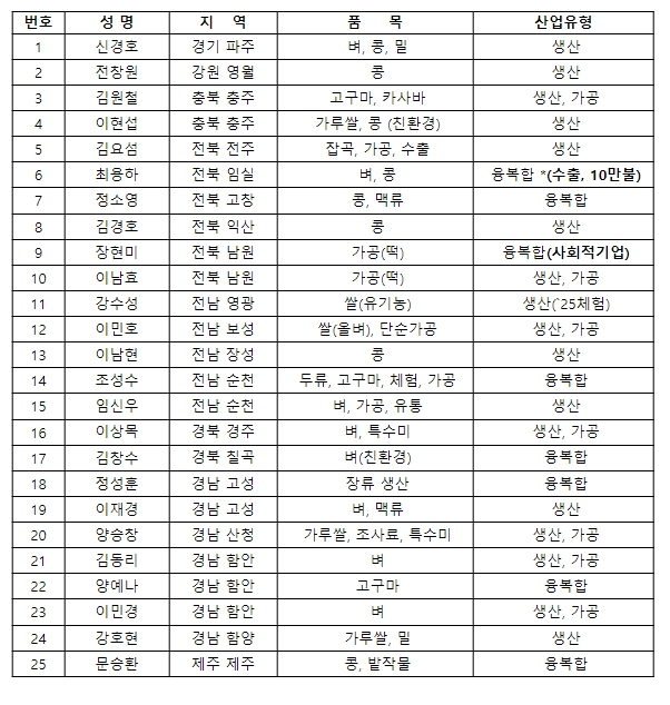스타청년농업인은 식량작물의 생산·가공·유통·판매 등 전 분야에서 활발히 활동하고 있는 청년 농업인을 가리킨다. 올해는 지방농촌기관과 국립식량과학원 연구부서, 현장 조사 등을 통해 추천받은 후보들 가운데 25명을 선발했다.