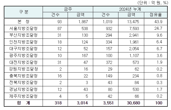 지역별 발주량을 보면 대전광역시 소재 본청 1,867억 원, 서울지방청 538억 원 등 2개청(2,405억 원)이 전체 금액(3,014억 원)의 79.8%를 차지하고 있으며, 인천 등 나머지 10개 지방청 609억 원이 각각 집행될 예정이다.