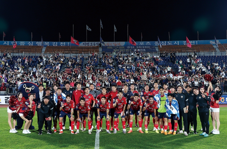 ▲ 지난 18일 김천상무 선수단이 제주전 승리 이후 단체사진을 찍고 있다 |
