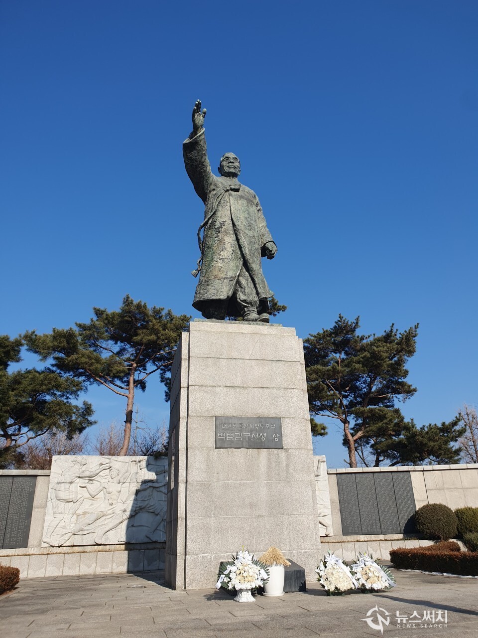 백범광장 내 백범김구 동상. 남산 백범광장에는 백범(白凡) 김구 선생님의 동상과 대한민국 초대 부통령 이시영 선생님의 동상이 있으며 바로 위에 ‘안중근의사기념관’도 자리 잡고 있다. 이곳은 일제강점기 때에 조선신궁이 있던 곳으로, 일제 식민지배의 상징을 항일 독립운동의 상징으로 대체하기 위해 독립운동에 커다란 노력을 기울인 인물들의 동상과 기념물 등을 설치한 것이다. 백범 김구 선생님은 대한민국임시정부 주석을 지냈으며 1949년 경교장에서 안두희에게 암살 당했다.