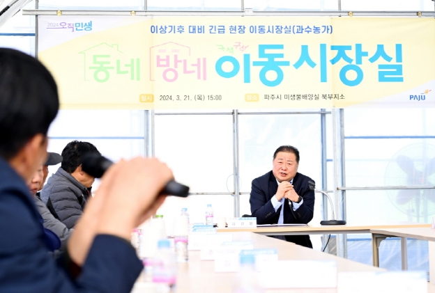 이날 이동시장실에서는 파주시사과연구회장, 파주시배연구회장, 파주시복숭아연구회장, 파주친환경농업인연합회장 등 과수 재배 농가 20여 명이 참여한 가운데 이상기후 대비 안정된 고품질 과수 생산을 주제로 서로 소통하며 현장의 목소리를 듣는 시간을 가졌다.