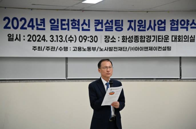 ▲ 2024년 일터혁신 컨설팅 지원사업 협약식에 앞서 인사말씀을 하고 있는 김근영 화성도시공사 사장.(화성도시공사 제공) |