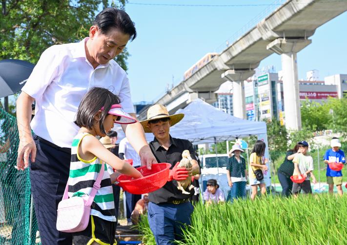 ▲ 김동근 시장이 8월 2일 중랑천 벼농사 체험장에서 시민들과 오리 방사 행사에 참여하고 있다. |