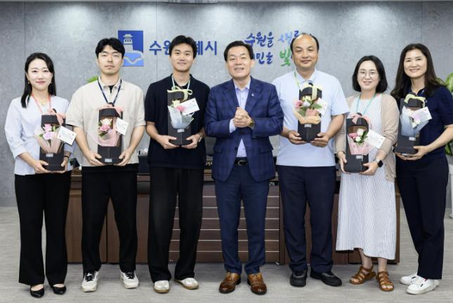 ▲ 이재준 수원시장(가운데)이 친절왕 공무원들과 함께하고 있다. |