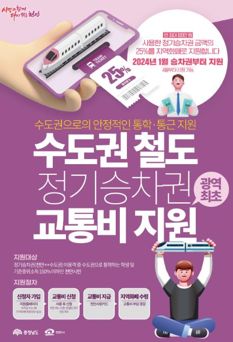 시는 일반철도, 고속철도 정기승차권을 이용해 수도권으로 통학하는 학생과 기준중위소득 150% 이하인 천안시민을 대상으로, 사용한 승차권 금액의 25%를 지역화폐로 환급한다.