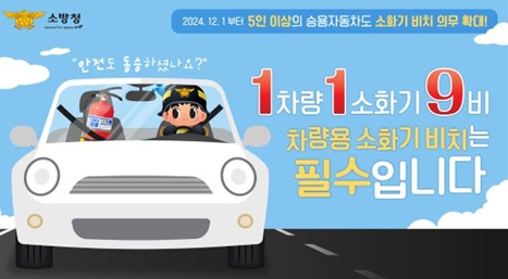 차량용 소화기는 7인승 이상의 승용차 및 화물차 등에만 차량용 소화기를 비치해야 했지만, 올해 12월부터 ‘소방시설 설치 및 유지관리에 관한 법률’에 따라 5인승 이상의 모든 차량에 차량용 소화기를 의무적으로 설치해야 한다.