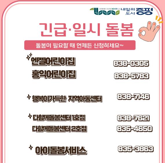 지역 내 긴급·일시 돌봄이 가능한 돌봄기관은 엔젤어린이집, 홍익어린이집, 행복이가득한 지역아동센터, 증평형 행복돌봄나눔터 8개소가 있다.