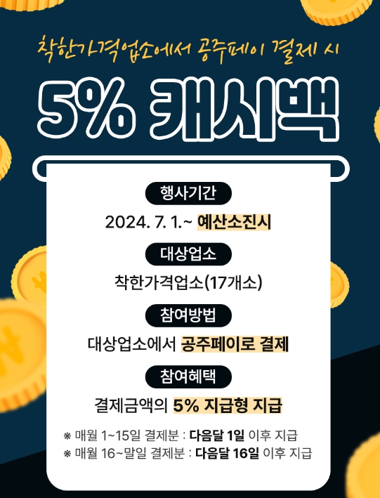 [뉴스서치] 공주시가 7월부터 착한가격업소에서 모바일 지역화폐인 공주페이로 결제할 경우 5% 추가 캐시백을 지원한다고 28일 밝혔다.