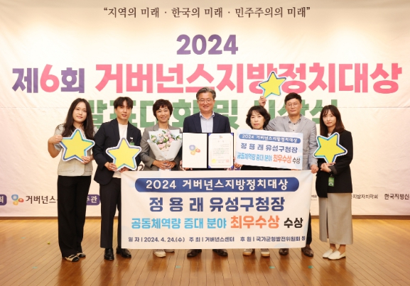 [뉴스서치] 정용래 유성구청장이 24일 국회도서관에서 열린 2024 거버넌스 지방정치대상 단체장 부문 공동체 역량증대 분야에서 최우수상을 수상했다.