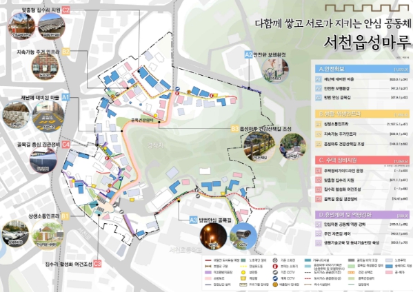 군은 서천읍 군사1리 마을에 2029년까지 ▲소방도로 및 주차장 조성 ▲커뮤니티시설 조성 ▲방치된 빈집과 슬레이트 철거 ▲ 주민역량 강화 지원 등을 추진할 계획이다.